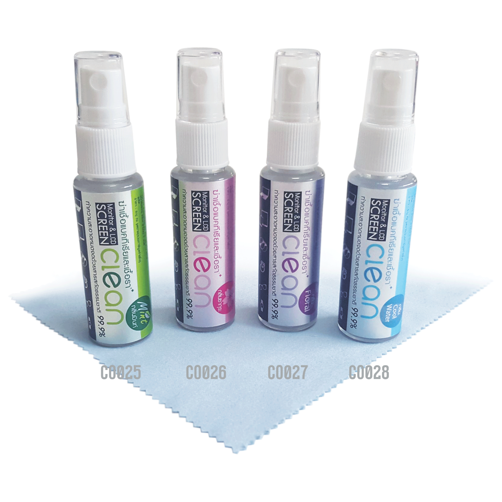 น้ำยาทำความสะอาดหน้าจอโทรศัพท์มือถือ แท็บเล็ต อุปกรณ์ต่างๆ ขนาดพกพา สกัดจากสารธรรมชาติ 100% มี 4 กลิ่นให้เลือก แถมฟรีผ้าไมโครไฟเบอร์ขนาด 18×18ซม ขนาดบรรจุ 25 ml